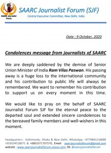 SAARC Journalist Forum SJF expressed deeply saddened on demise of Senior Union Minister of India Ram Vilas Paswan.