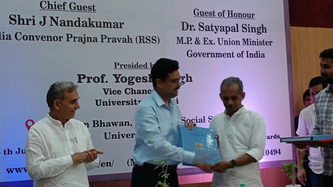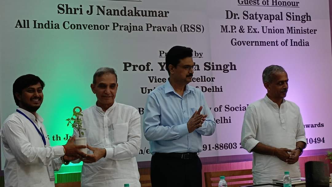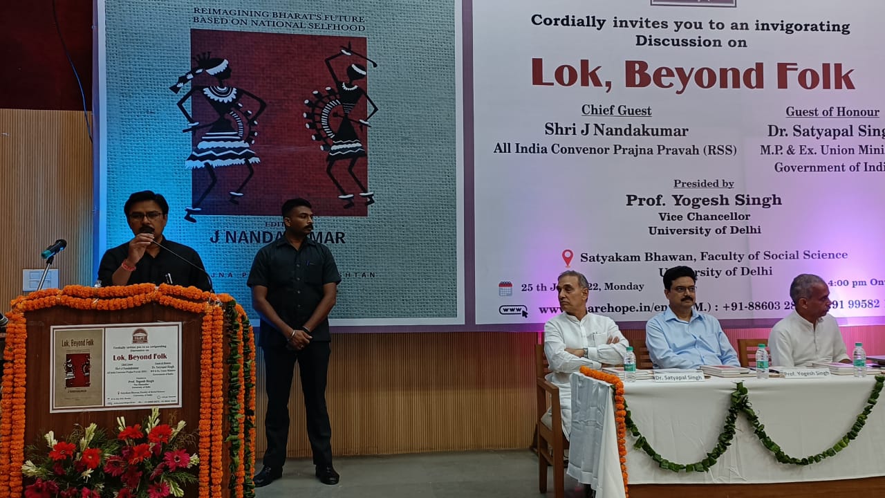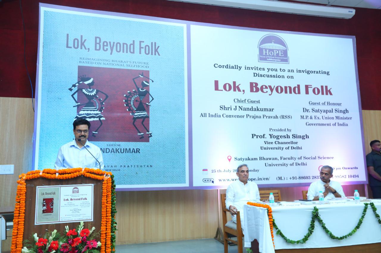 New Delhi. Under the auspices of the House of Political Empowerment, a Research and Innovation Institute (HOPE), All India Convener of Prajna Pravah and editor of the book ‘Lok, Beyond Folk’, Shri J Nandkumar was the Chief guest of programme.The program was presided over by the Vice-Chancellor of Delhi University, Prof. Yogesh Singh and Guest of Honour former Union Minister and MP, Dr. Satyapal Singh were other eminent personalities who participated in book discussion.Eminent political scientist, presently Director of University of Delhi (South Campus), Prof. Shri Prakash Singh expressed his views and further enriched the discussion. Prof. Yogesh Singh initiated the discussion and expressed concern over the decline of national self-respect for many centuries and expressed hope for restoration of national self-respect under the National Education Policy 2020. He said that the role of teaching fraternity is utmost important in making youth to feel the national self-respect and how to protect it.