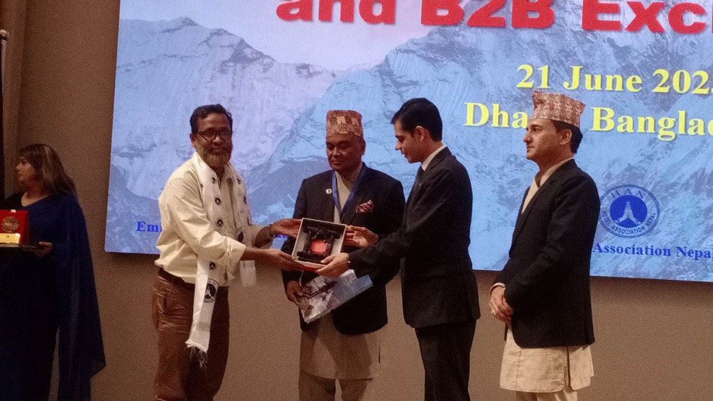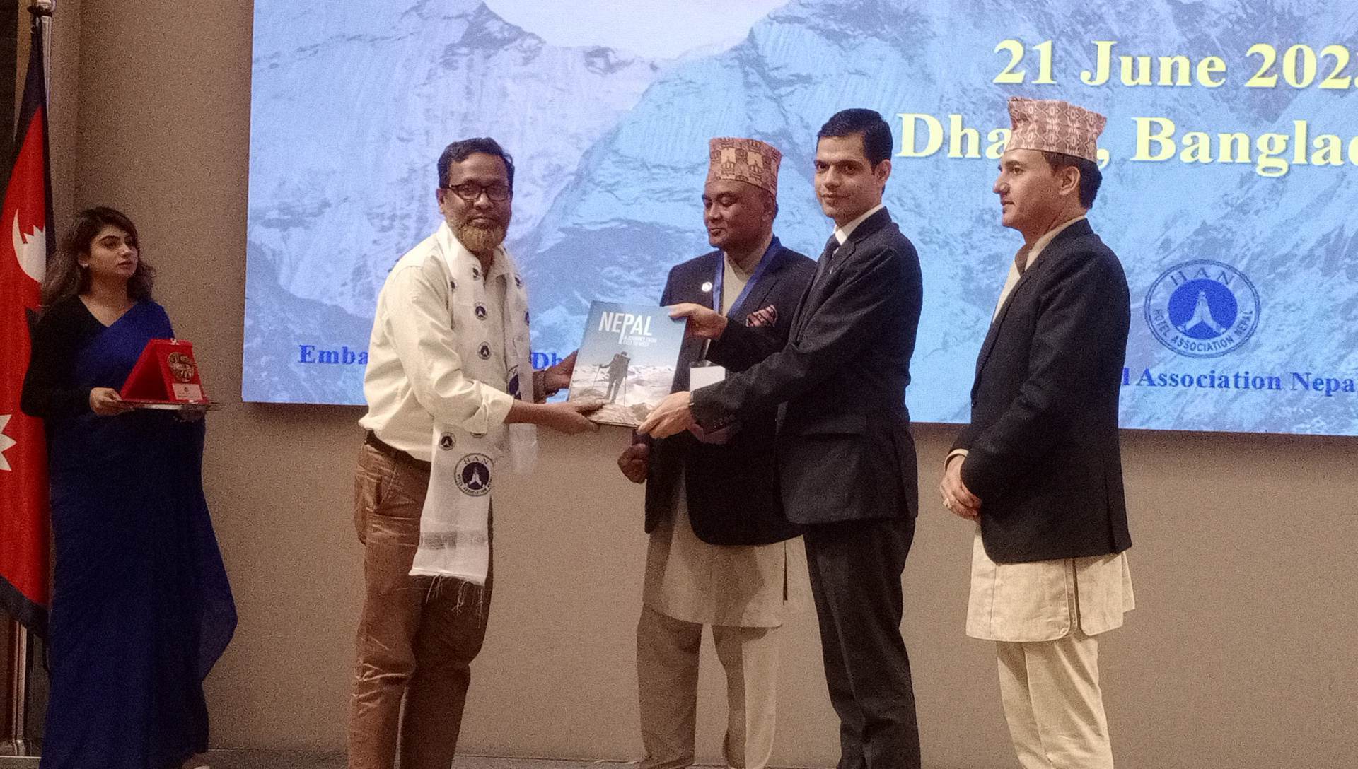 On the initiative of Hotel Association of Nepal, Nepal Tourism Board and Nepal Embassy, Ambassador of Nepal to Bangladesh Ganashyam Bhandari presented a special honor to Secretary General of SAARC Journalist Forum Md Abdur Rahman in the program.