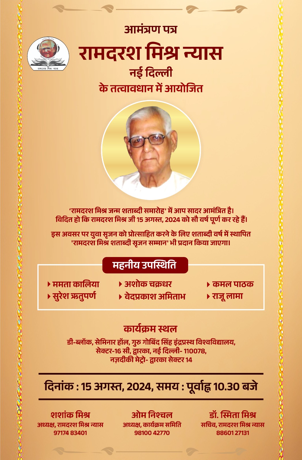 New Delhi. Ramdarash Mishra Trust is celebrating Cenetenary of Eminent Hindi Writer Ram Darash Mishra who is completing 100 years of his life on 15th August 2024. In the history of Hindi literature this is the first time that a writer himself witnessing his Centenary.