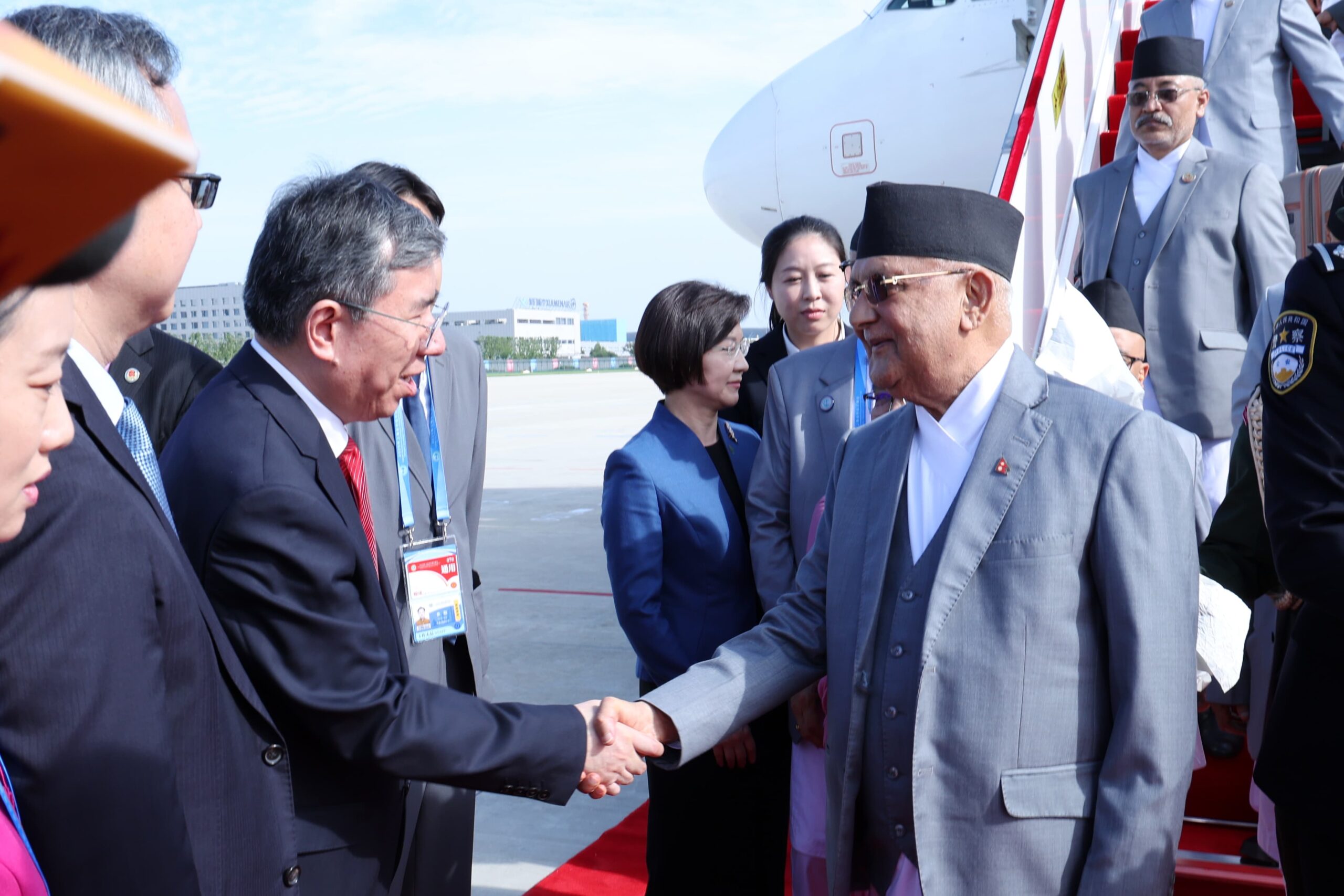 He was welcomed by high-ranking officials of the Chinese government and Chinese Ambassador to Nepal Dr. Krishna Prasad Oli, Chinese Ambassador to Nepal Chen Song, and others.